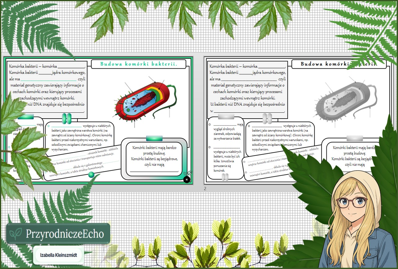 Karta pracy „Budowa komórki bakterii” w pdf. Biologia. Klasa 5. Dział „Budowa i czynności życiowe organizmów”.