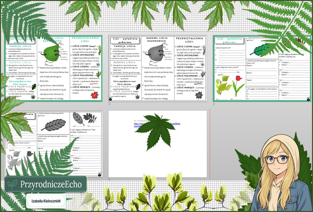 Mały zestaw na jedną lekcję: sketchnotka/notatka, karta pracy plus gratisowa prezentacja multimedialna „Liść – wytwórnia pokarmu” w pdf. Biologia. Klasa 5. Dział „Tkanki i organy roślinne ”.