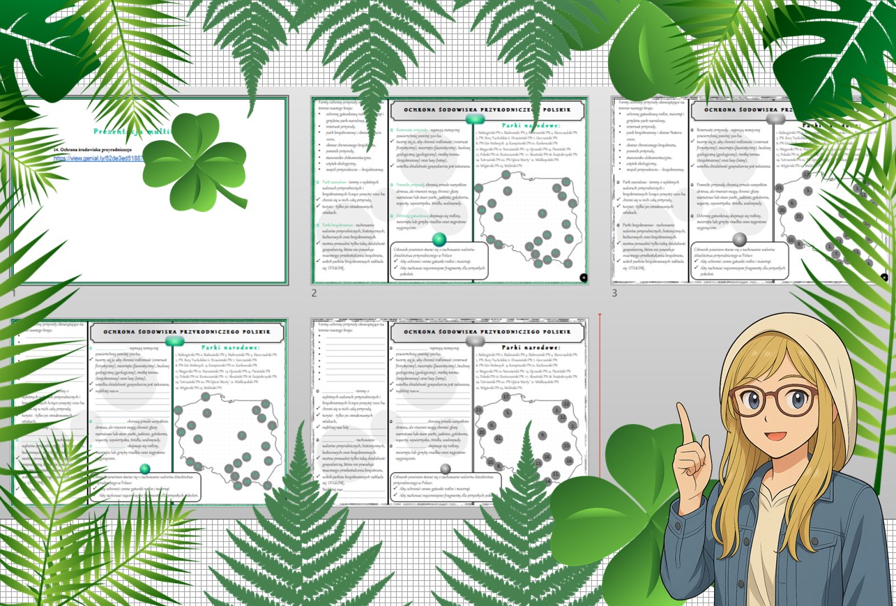 Mały zestaw na jedną lekcję: sketchnotka/notatka, karta pracy plus gratisowa prezentacja multimedialna „Ochrona środowiska przyrodniczego Polski” w pdf. Geografia. Klasa 7. Dział „Środowisko przyrodnicze Polski”.