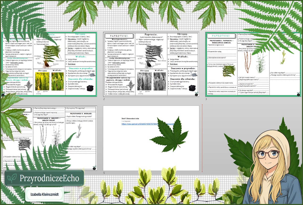Mały zestaw na jedną lekcję: sketchnotka/notatka, karta pracy plus gratisowa prezentacja multimedialna „Paprotniki” w pdf. Biologia. Klasa 5. Dział „Różnorodność roślin”.