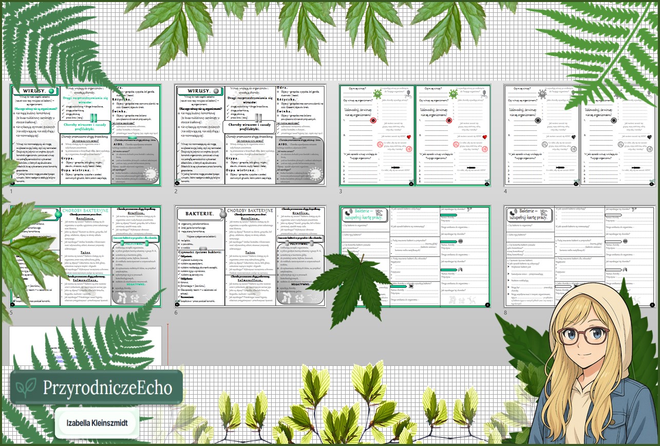 Mały zestaw na jedną lekcję: sketchnotka/notatka, karta pracy plus gratisowa prezentacja multimedialna „Wirusy i bakterie” w pdf. Biologia. Klasa 5. Dział „„Wirusy, bakterie, protisty i grzyby”.