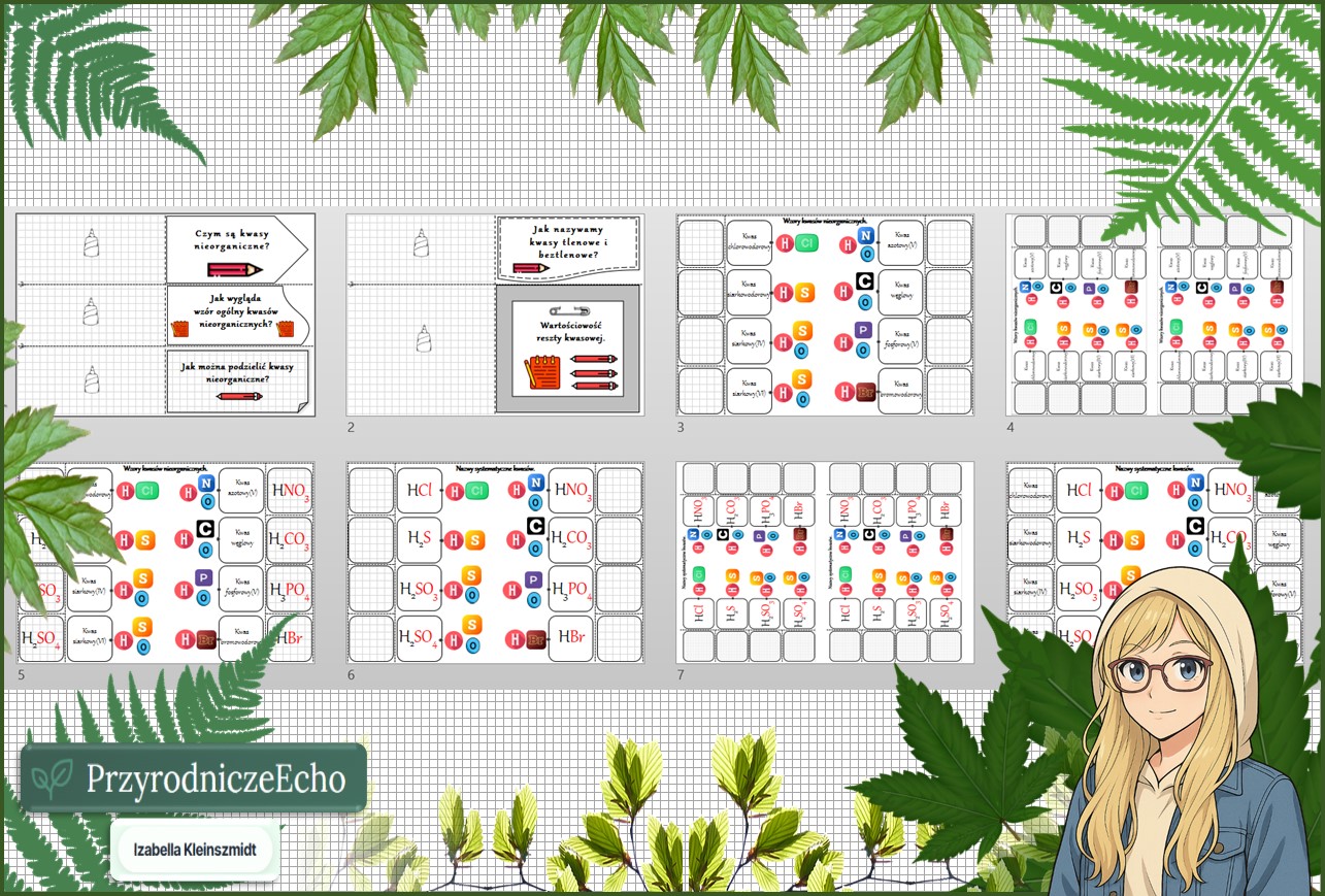 Notatka okienkowa/stacja zadaniowe/notatka interaktywna/notatka graficzna/karta pracy/sketchnotka „Wzory i nazwy kwasów”, w pdf. Chemia 7 i 8 , dział „Kwasy”. Materiał wykonany na podstawie podręcznika z wydawnictwa MAC.