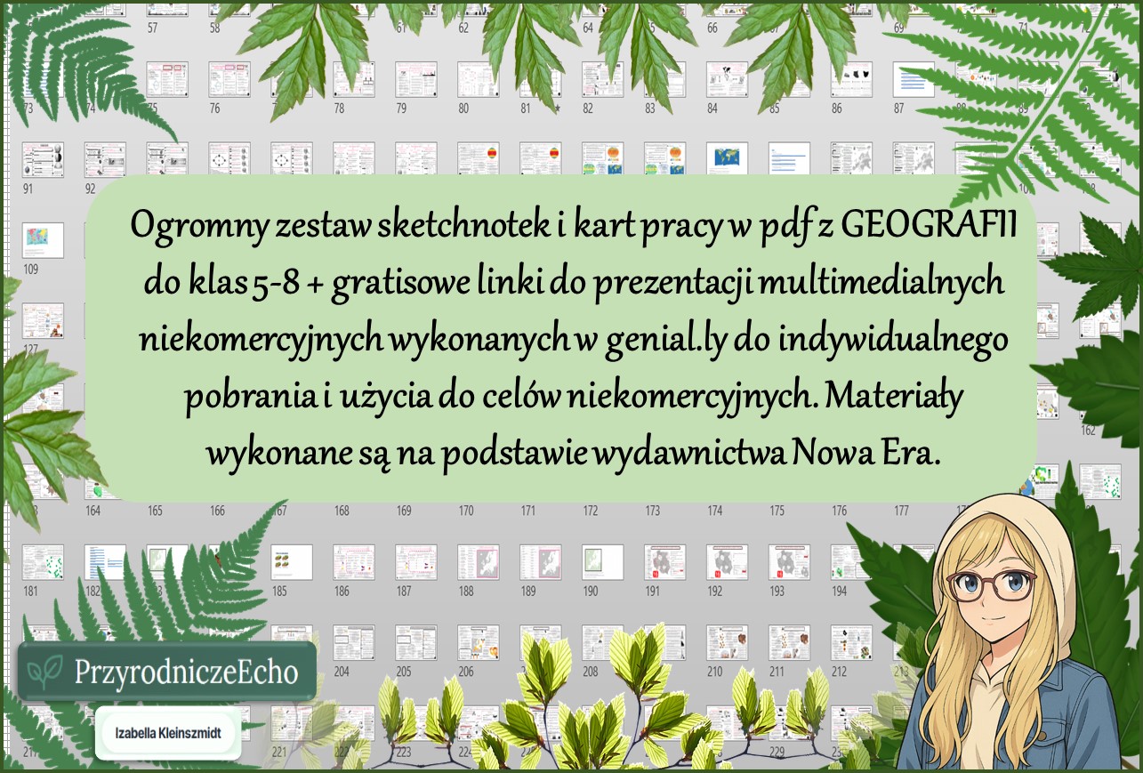 Ogromny zestaw sketchnotek i kart pracy w pdf z GEOGRAFII do klas 5-8 + gratisowe linki do prezentacji multimedialnych niekomercyjnych wykonanych w genial.ly do indywidualnego pobrania i użycia do celów niekomercyjnych. Materiały wykonane są na podstawie wydawnictwa Nowa Era.