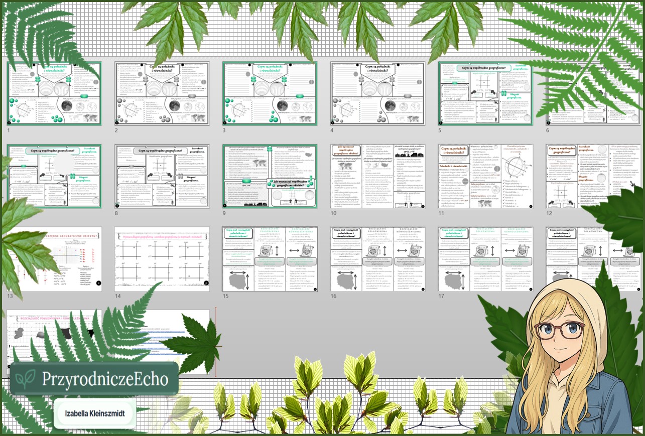 Średni zestaw na lekcje do całego działu: sketchnotki/notatki, karty pracy plus gratisowe prezentacje multimedialne w pdf. Geografia. Klasa 6. Dział „Współrzędne geograficzne”.